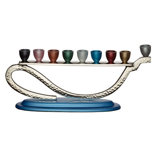 Hammered aluminum menorah with colored reeds 30.5x8.5